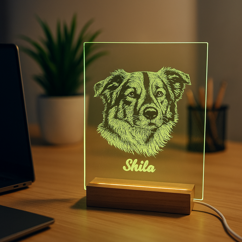 Mit dem stabilen Holzsockel und der dezenten Beleuchtung sorgt die Lampe für eine gemütliche Atmosphäre – ideal als Nachtlicht, Dekoration auf dem Schreibtisch oder als bleibende Erinnerung an dein geliebtes Haustier.