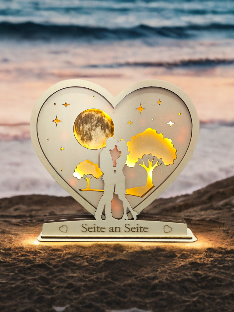 Gefertigt aus hochwertigem Material und mit präzisen Ausschnitten gearbeitet, entsteht ein sanfter Lichteffekt, der Ruhe, Wärme und Geborgenheit ausstrahlt. Der Schriftzug „Seite an Seite“ auf dem Sockel unterstreicht die emotionale Bedeutung dieses besonderen Herzens.