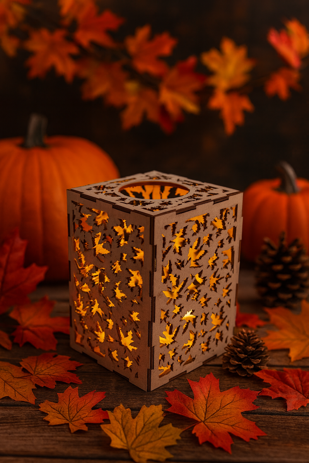🍂 Holz-Teelichthalter „Herbstzauber“ – mit filigranem Blätterdesign