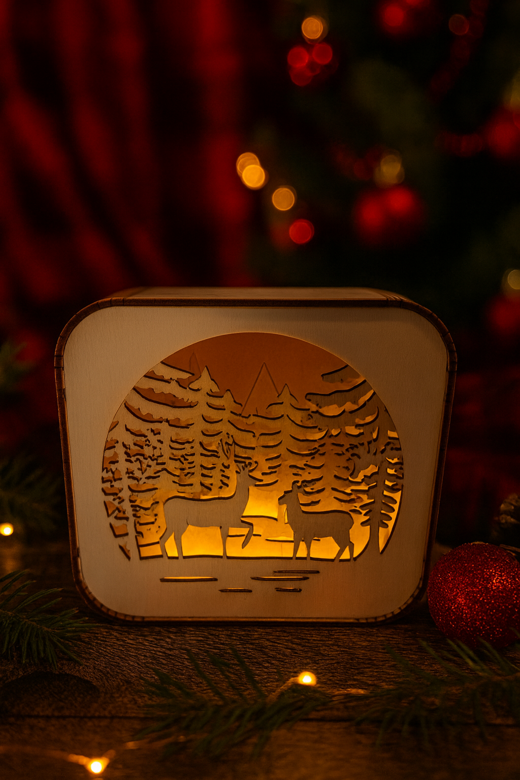 🌲 3D-Holzlicht mit LED – „Winterwald mit Rehen“
